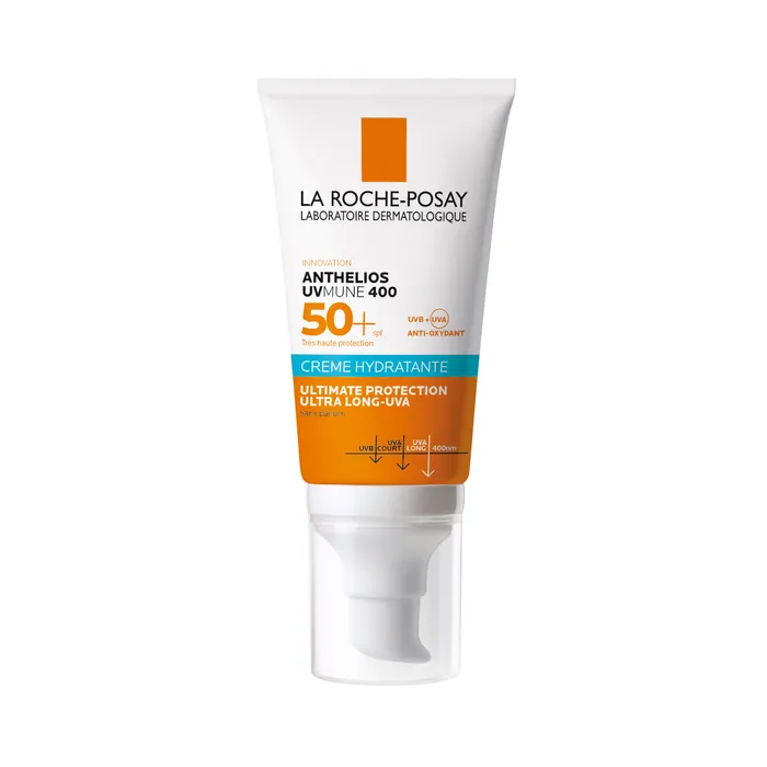 La Crème Solaire Hydratante sans parfum Très Haute Protection SPF50+ Anthelios de La Roche Posay contient un nouveau filtre UV Mexoryl 400 issu d'une innovation scientifique, qui renforce la protection contre les UV les plus insidieux, aussi appelés UVA ultra-longs. Parce qu'ils sont imperceptibles et dommageables, ces UV impactent la peau toute l'année.