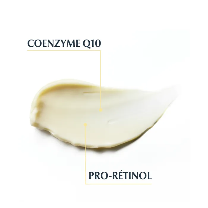 L'ubiquinone stimule la production d'énergie à l'intérieur des cellules. De plus, le pro-rétinol stimule le processus de régénération de la peau durant la nuit. Pour les peaux sensibles. Sans parfum. Sans alcool. Sans colorant.